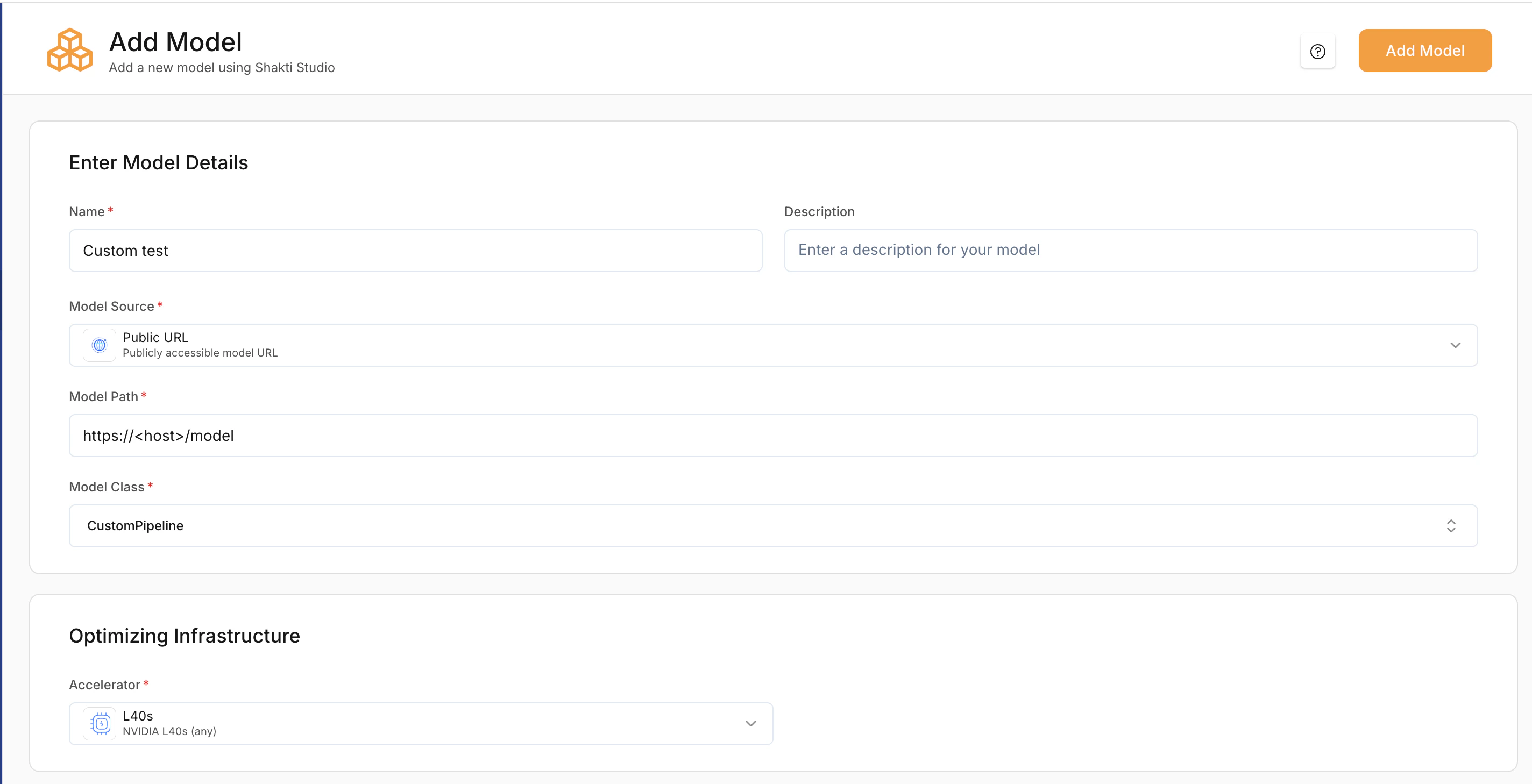 When adding the model in the UI, select the appropriate Model Source, set the Model Path to the location of the ZIP file, and choose Custom Pipeline / Custom Model as the model type. The platform unpacks the archive, sets up the environment, and loads the model using your configuration.Open Add Model